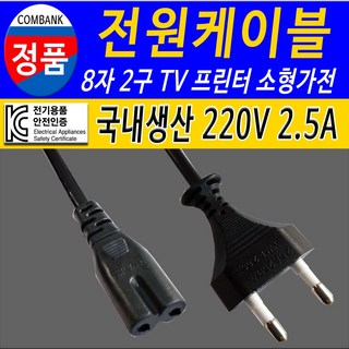 KC인증 국내생산 2구 8자 전원케이블 / 삼성 엘지 LG 해외 직구 수입 가전제품 TV 공기청정기 AC220V 전원 연결 코드 케이블 선 1.5M 3M, 1개