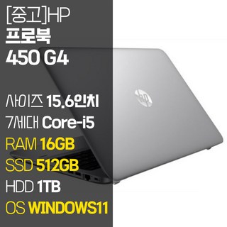 HP 프로북 450 G4 인텔 7세대 Core-i5 RAM 16GB M.2 SSD + HDD 1TB 윈도우 11설치 사무용 중고노트북, ProBook 450 G4, WIN11 Pro, 1512GB, 코어i5