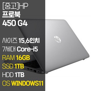 HP 프로북 450 G4 인텔 7세대 Core-i5 RAM 16GB M.2 SSD + HDD 1TB 윈도우 11설치 사무용 중고노트북, ProBook 450 G4, WIN11 Pro, 2TB, 코어i5