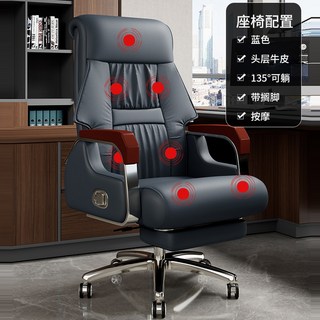 소가죽 임원의자 중역 컴퓨터 중역의자 사장님 사무용, 블루 소가죽+발걸이+마사지, 강철 다리, 고정손잡이